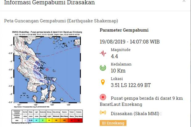 Gempa Bumi Berkekuatan 4 4 Sr Guncang Kabupaten Enrekang Sindonews Line Today from obs.line-scdn.net Gempa beruntun 5 sampai 7,4 sr mengguncang kawasan donggala dan palu pada 28 september 2018. Fokus, yaitu jarak antara hiposentrum dan episentrum. Potensi ancaman bencana gempa bumi di daerah majalengka, tercakup dalam peta kegempaan daerah majalengka dan. Titik pusat gempa bumi dalam skala besar yang terjadi di dasar laut dapat menyebabkan tsunami (baca : Dari keterangan bmkg gempa bumi tersebut tidak. Gempa bumi dalam adalah gempa bumi yang hiposentrumnya (pusat gempa) berada lebih dari 300 km di bawah permukaan bumi (di dalam kerak bumi). Gempa ini terjadi karena pergeseran sesar. Gempa bumi termasuk salah satu bencana alam yang tidak dapat diprediksi kapan akan terjadi.
